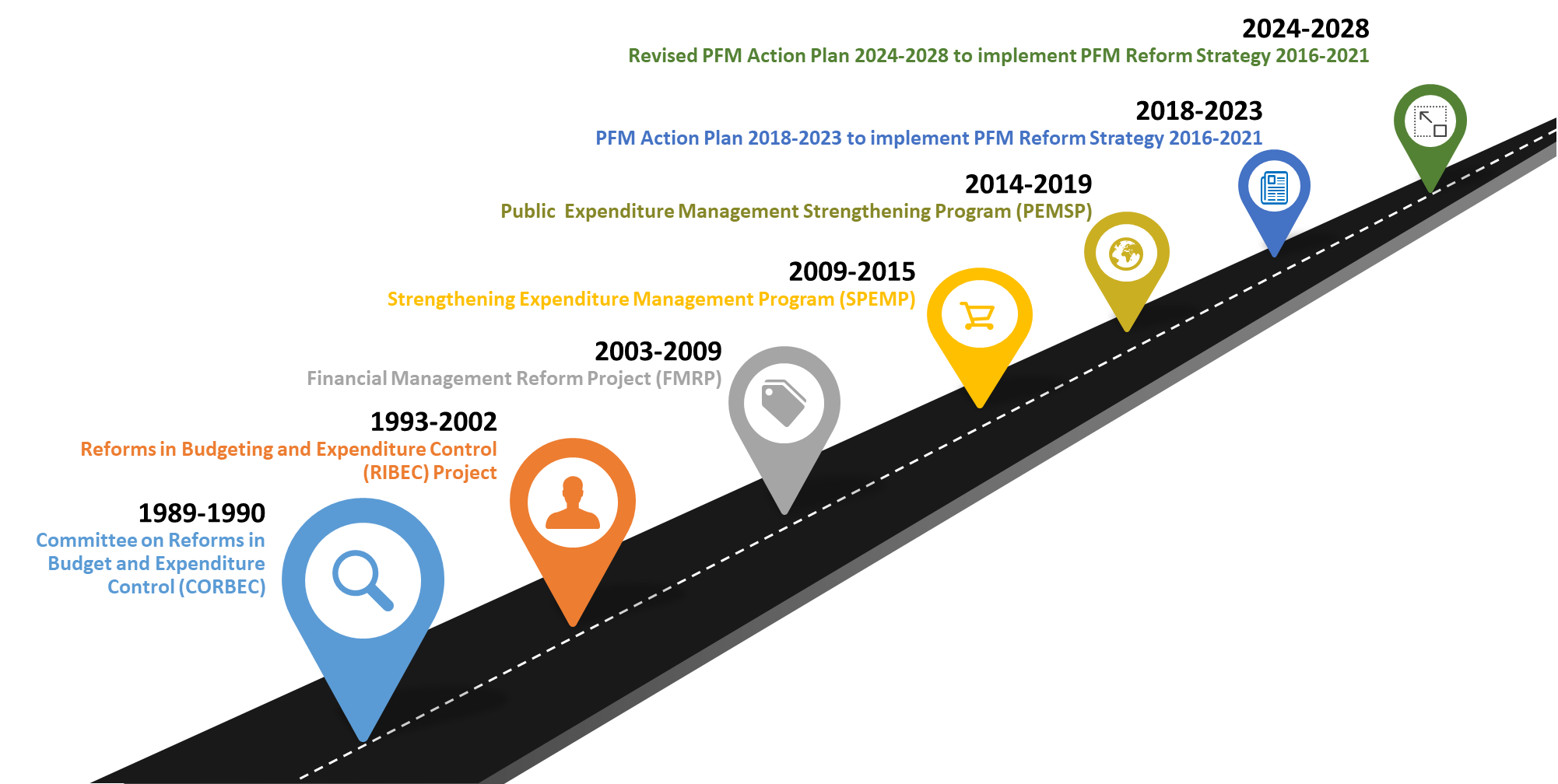 In this connection, the Bangladesh Public Financial Management (PFM) Reform Strategy (2016-21), approved by the Minister of Finance in August 2016, clearly sets out the key goals of the PFM reforms and identifies the priority reform actions. The Strategy was developed by a cross-institutional team from the Ministry of Finance, the Office of the Comptroller and Auditor General, the Planning Commission, and the National Board of Revenue, among others. A PFM Action Plan (2018-2023) and Revised PFM Action Plan (2024-2028) has been subsequently approved, to support effective implementation of the Strategy. This PFM Action Plan provides the implementation roadmap for those priority actions with clear institutional responsibilities, cost-benefit analysis of sub-activities, and results indicators to monitor the successful implementation. The PFM Action Plan also elaborates on the governance structure for reforms and the change management approach introduced earlier in the Strategy. Following figure shows the PFM reform journey in brief-