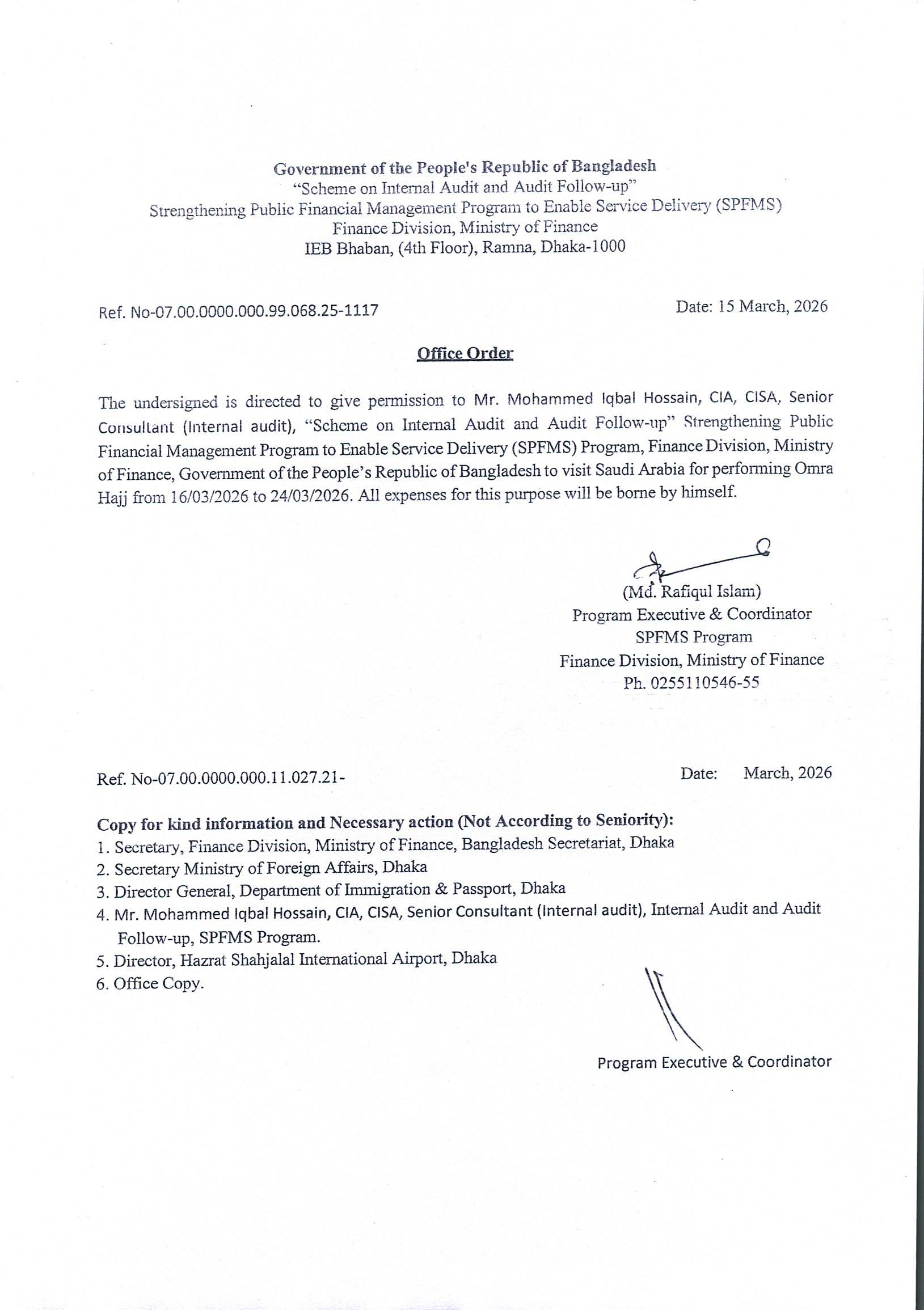 Government Order on Ex-Bangladesh leave in favor of Nahid Al Fuad, IT Consultant of Scheme on Improvement of Public Financial Services Delivery through Implementation of BACS and iBAS++ under Strengthening Public Financial Management Program to Enable Service Delivery (SPFMS), Finance Division, Ministry of Finance, Government of the People's Republic of Bangladesh